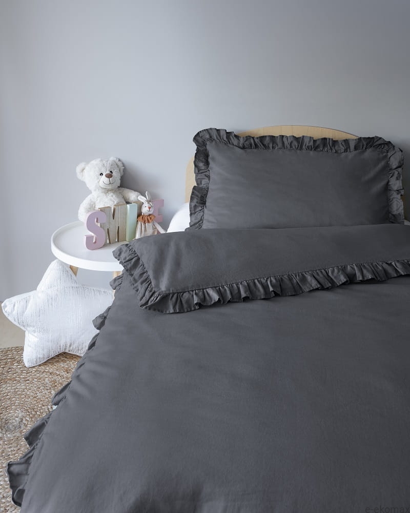 Grafitowa pościel PURE z falbaną to doskonały wybór dla tych, którzy cenią połączenie wygody, trwałości i ponadczasowego stylu. Jej głęboki kolor oraz miękkość materiału zapewnią dziecku komfortowy i spokojny sen każdej nocy.