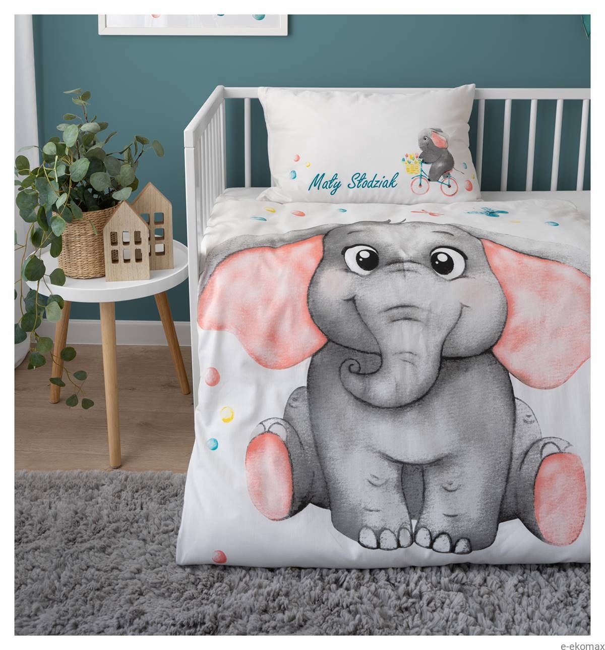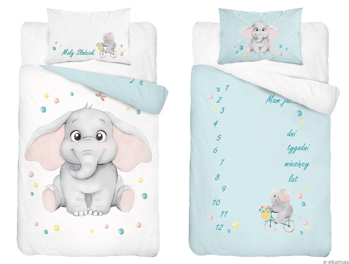 Wprowadź do dziecięcego pokoju radość i uśmiech dzięki uroczej pościeli z motywem słodkiego słonika. Zestaw o wymiarach 90x120 został zaprojektowany z myślą o najmłodszych — na jednej stronie widnieje uśmiechnięty słoń otoczony kolorowymi kuleczkami i napisem „Mały Słodziak”, a na drugiej liczby od 1 do 12 z miejscem na oznaczenie wieku dziecka w dniach, tygodniach, miesiącach lub latach. To doskonała pościel i jednocześnie tło do pamiątkowych zdjęć.
