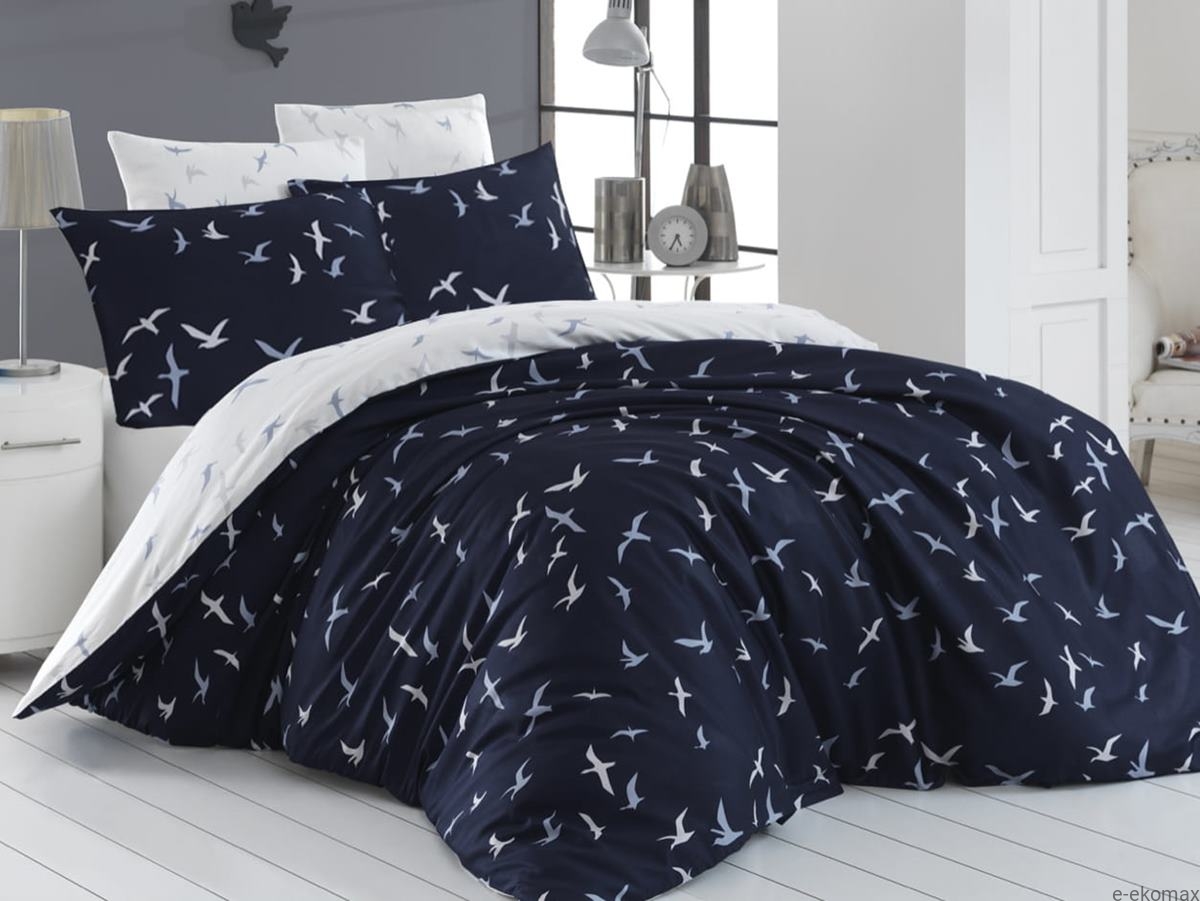Pościel ekskluzywna bawełna satynowa granatowo biała 160x200 w ptaki