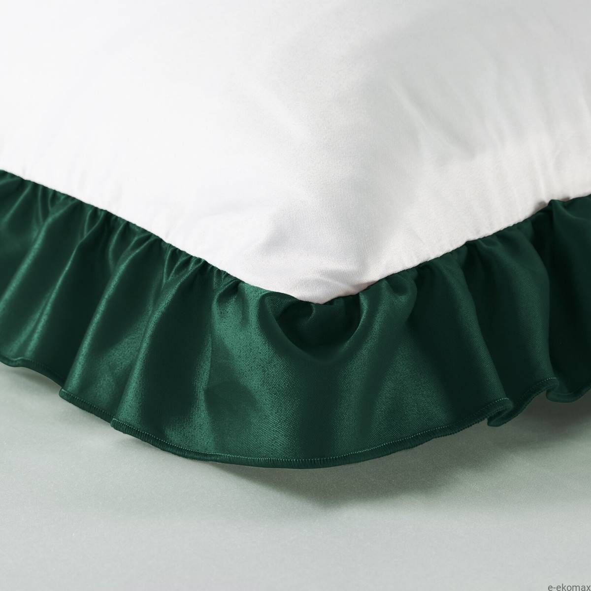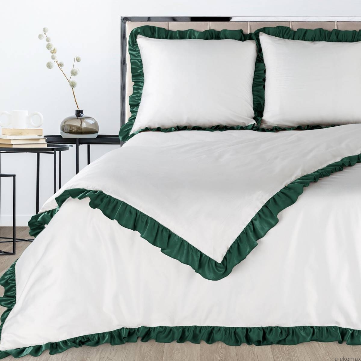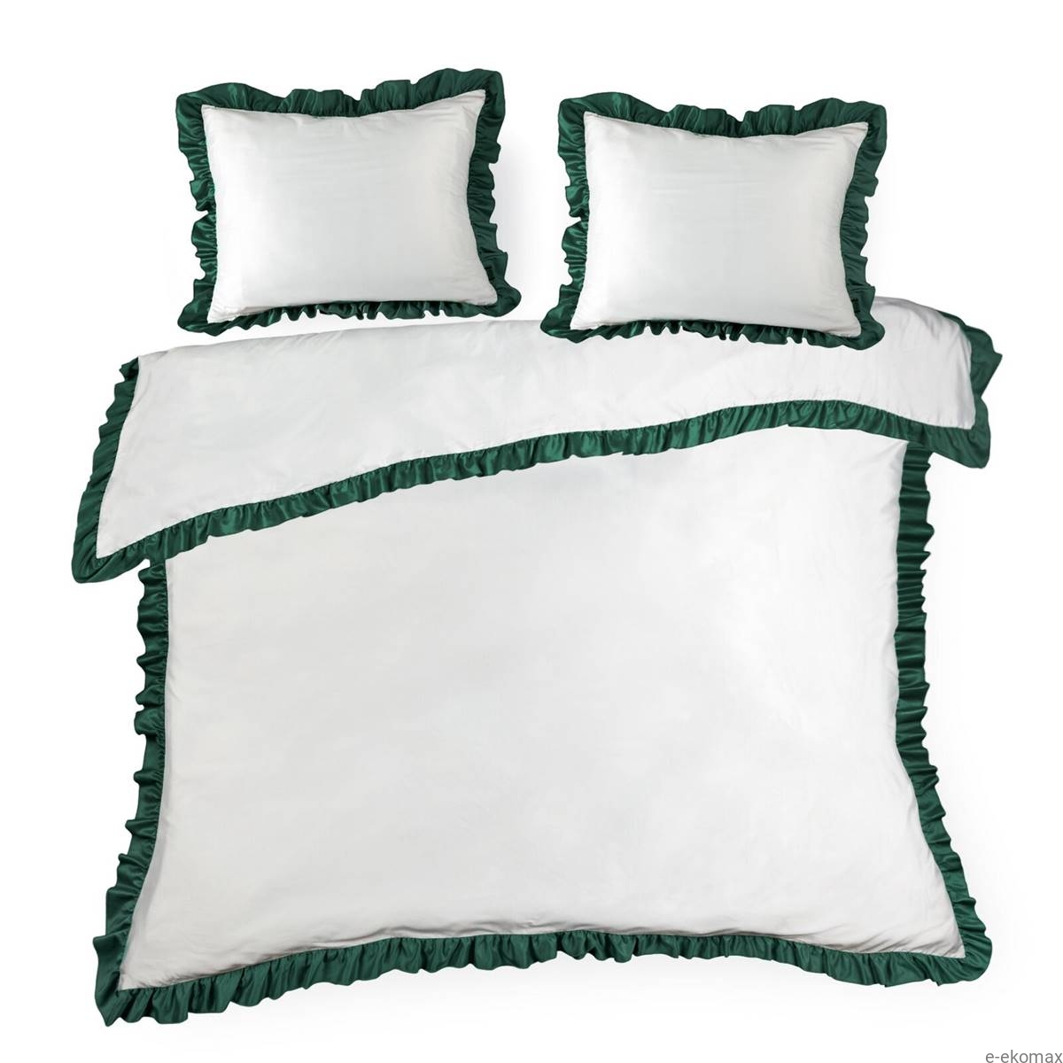 Pościel Eliza 220x200 biała z ciemnozieloną falbaną