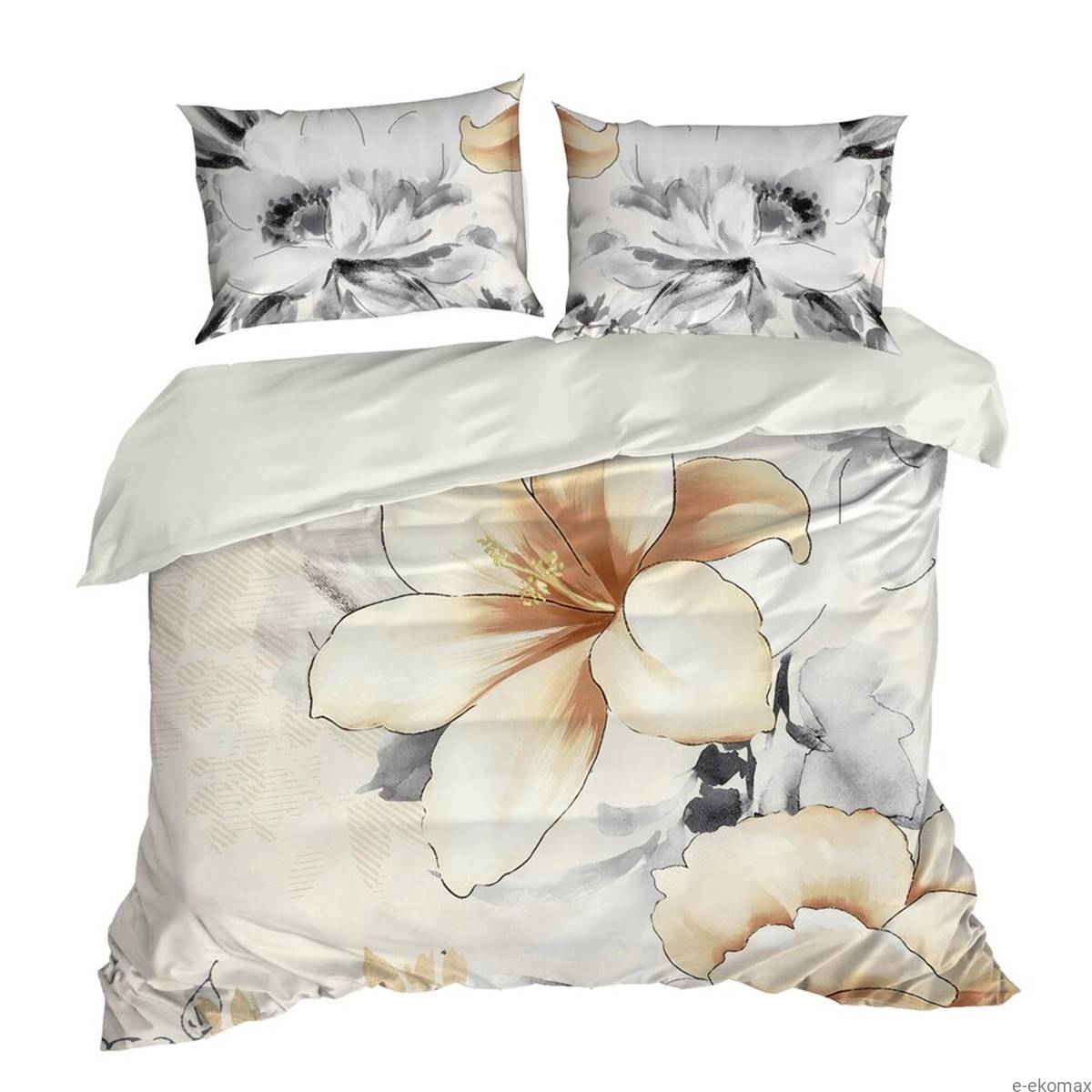 Wzór inspirowany naturą – subtelne, duże kwiaty w odcieniach beżu, szarości i złamanej bieli – doskonale wpisuje się zarówno w klasyczne, jak i nowoczesne wnętrza. Dzięki starannemu wykończeniu i naturalnemu połyskowi satynowego splotu, pościel prezentuje się niezwykle efektownie. Zamek błyskawiczny ukryty w poszwie sprawia, że zakładanie i zdejmowanie pościeli jest szybkie i wygodne.