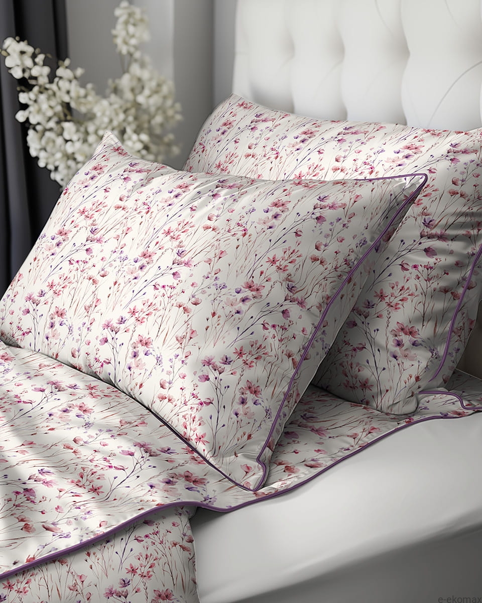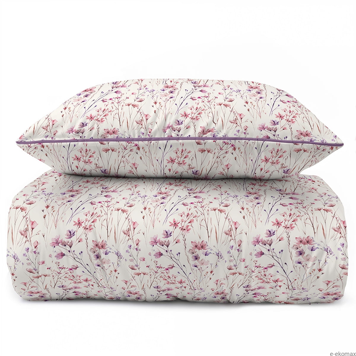 Odkryj wyjątkowy urok pościeli perkalowej 160x200 inspirowanej delikatnym pięknem łąkowych kwiatów. Na jasnym kremowym tle pojawia się subtelna kompozycja smukłych gałązek z drobnymi kwiatami w odcieniach różu, fioletu i pudrowej czerwieni, które nadają całości lekkości i romantycznego charakteru. Wzór przypomina kwitnącą letnią łąkę i wprowadza do sypialni spokojną, naturalną atmosferę. Eleganckie wykończenie w postaci ozdobnej lamówki w odcieniu delikatnego fioletu podkreśla krawędzie pościeli i dodaje kompletowi wyrafinowanego stylu.