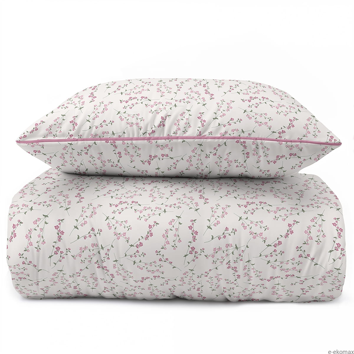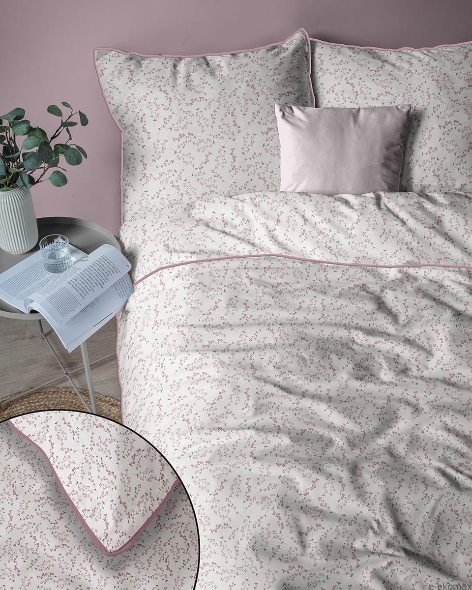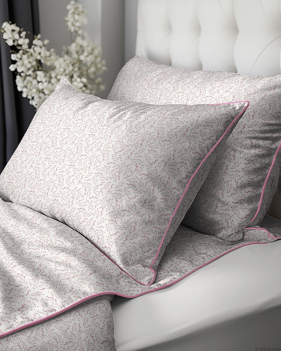Odkryj subtelne piękno pościeli perkalowej 160x200, która zachwyca lekkim, romantycznym wzorem inspirowanym delikatnymi kwiatami łąkowymi. Na jasnym kremowym tle pojawiają się drobne różowe kwiatuszki na cienkich gałązkach, tworzące spokojną i harmonijną kompozycję. Całość nadaje sypialni świeżości oraz przytulnego, naturalnego charakteru. Eleganckie wykończenie w postaci różowej ozdobnej lamówki podkreśla krawędzie pościeli i dodaje kompletowi wyjątkowej subtelności.