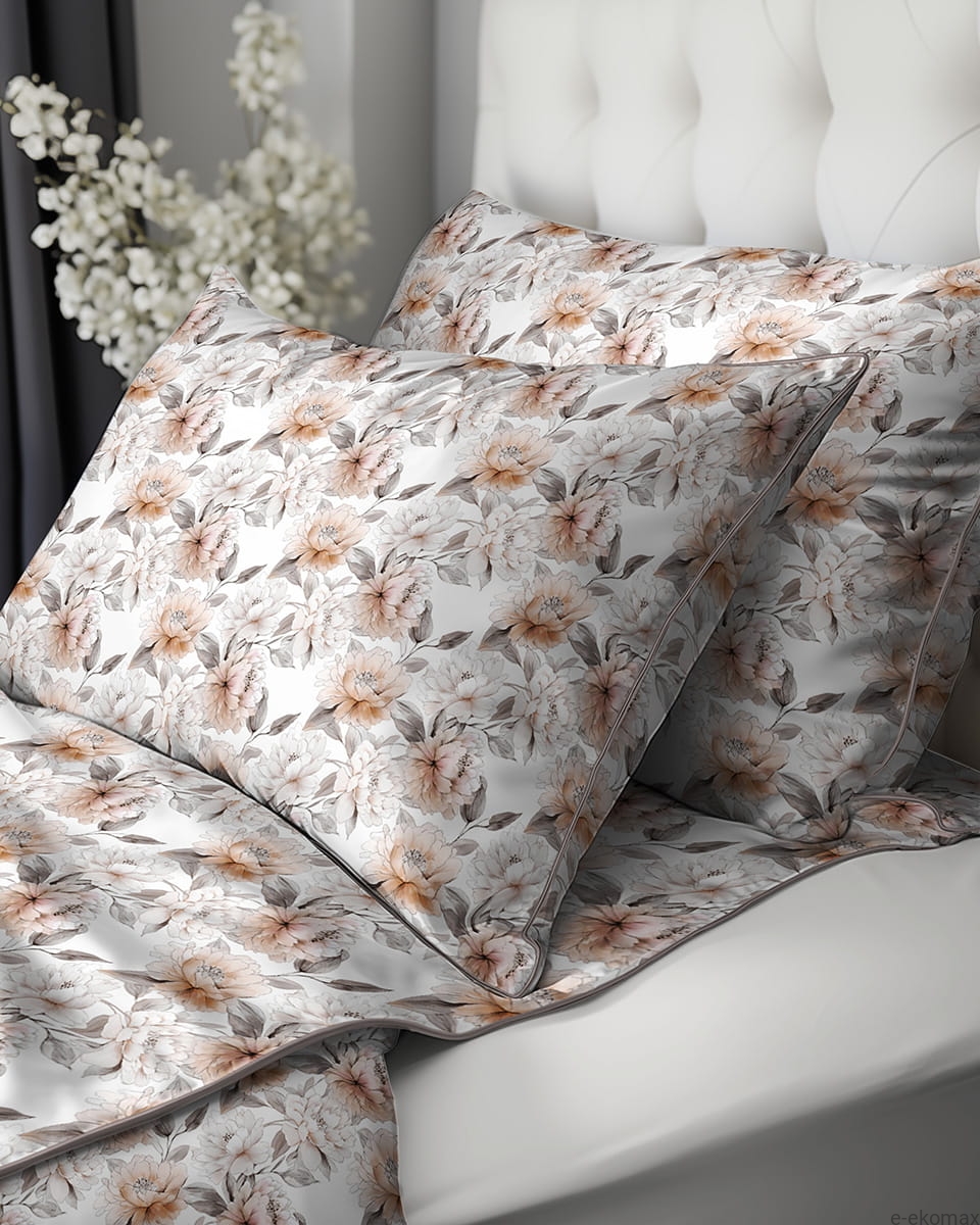 Odkryj wyjątkowy urok pościeli perkalowej 160x200, ozdobionej subtelnym, malarskim wzorem dużych kwiatów w odcieniach kremu, beżu i delikatnej brzoskwini. Jasne tło w połączeniu z naturalnymi, stonowanymi liśćmi tworzy harmonijną kompozycję inspirowaną naturą, która nadaje sypialni eleganckiego i spokojnego charakteru. Całość wykończona została dekoracyjną lamówką, która podkreśla estetykę kompletu i dodaje mu wyjątkowej lekkości.