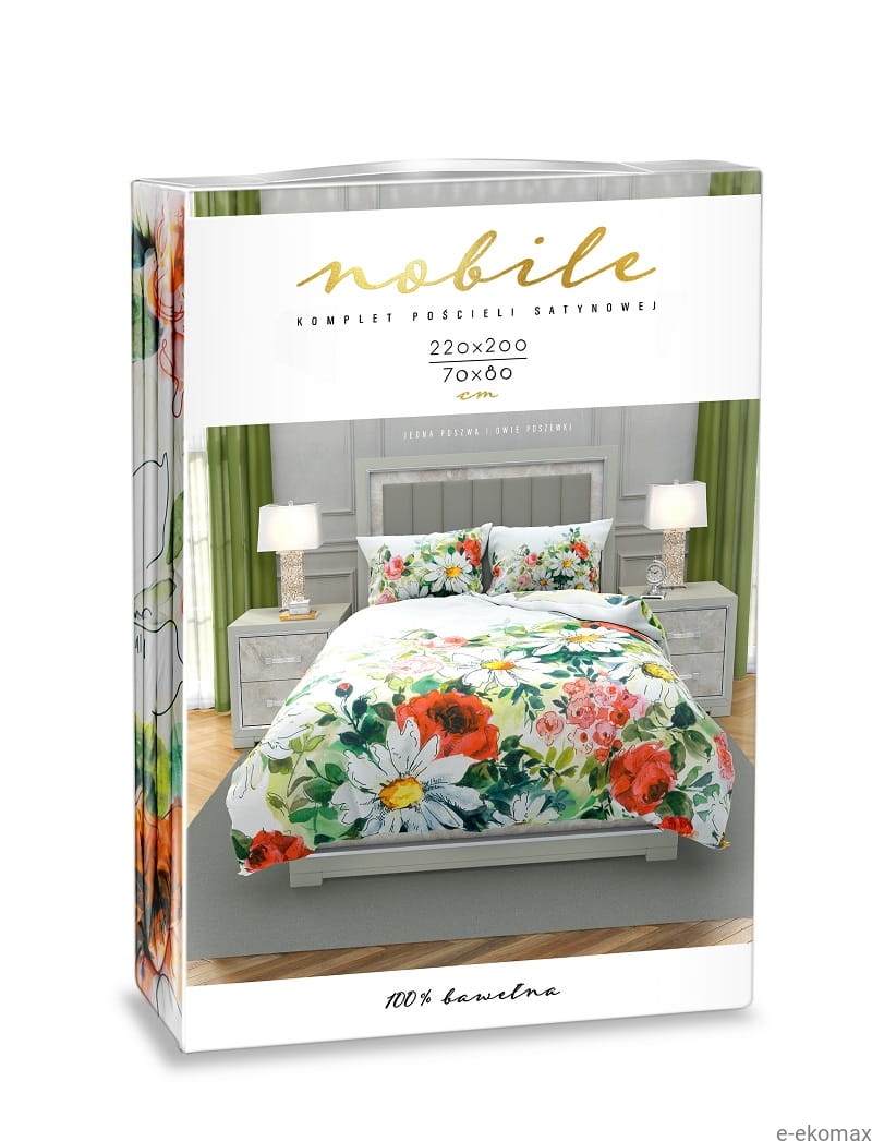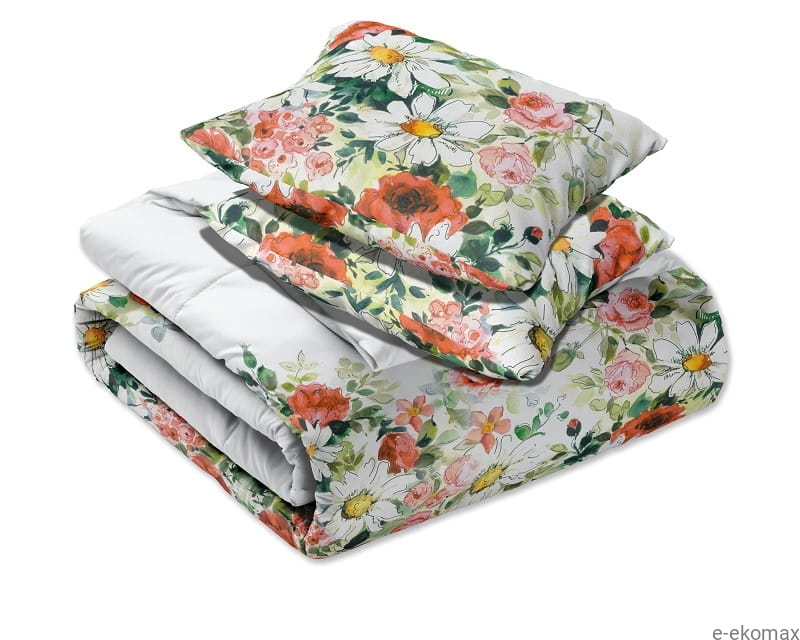 Romantyczny wzór inspirowany malarskimi akwarelami przedstawia subtelną kompozycję kwiatów – białe margerytki, delikatne róże i zielone liście na jasnym tle tworzą efekt lekkości i świeżości. Taka stylistyka nadaje sypialni przytulny, harmonijny charakter. Pościel jest dwustronna – jedna strona ozdobiona jest pięknym florystycznym nadrukiem, natomiast druga pozostaje klasycznie biała, co pozwala na łatwe dopasowanie aranżacji do własnych preferencji.