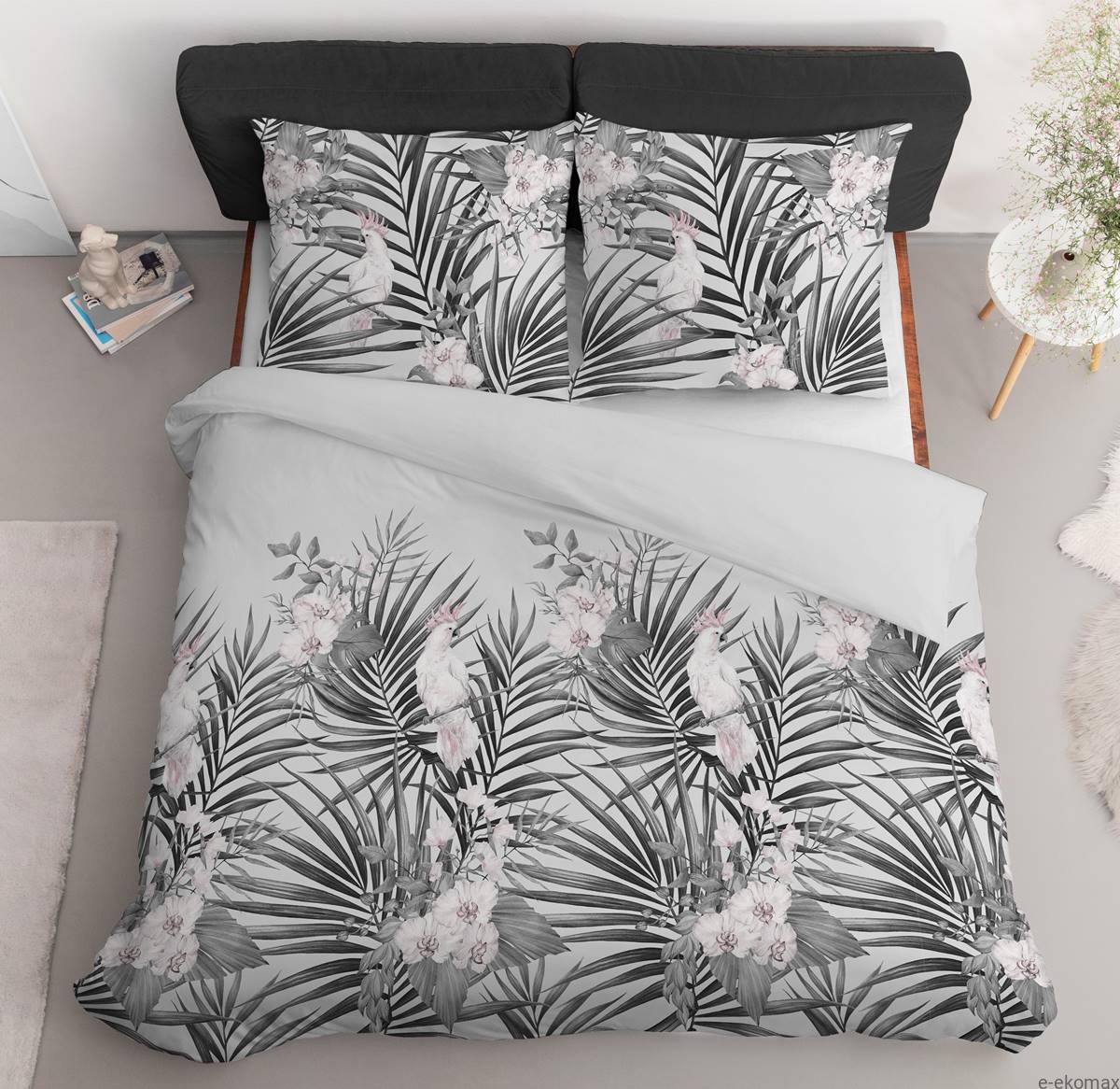 Ten komplet pościeli 220x200 zachwyca wysmakowanym połączeniem tropikalnego wzoru i nowoczesnej, monochromatycznej estetyki. Wzór przedstawiający papugi kakadu wśród dużych liści palmowych i subtelnych kwiatów został utrzymany w eleganckiej palecie szarości z delikatnym różowym akcentem – co nadaje całości kobiecego, a zarazem bardzo współczesnego charakteru. To propozycja dla miłośników spokojnych, ale wyrazistych aranżacji, którzy cenią połączenie natury z minimalizmem.