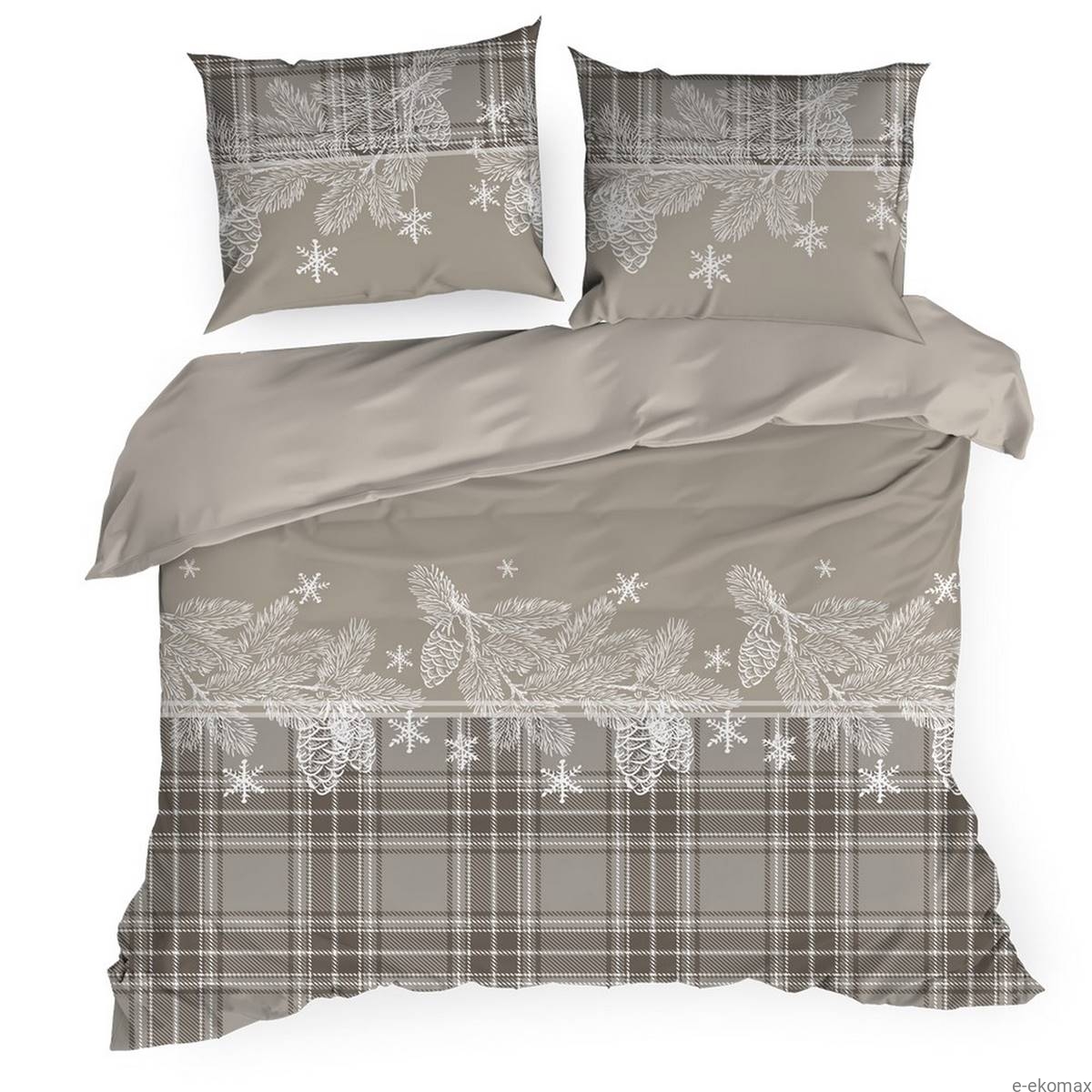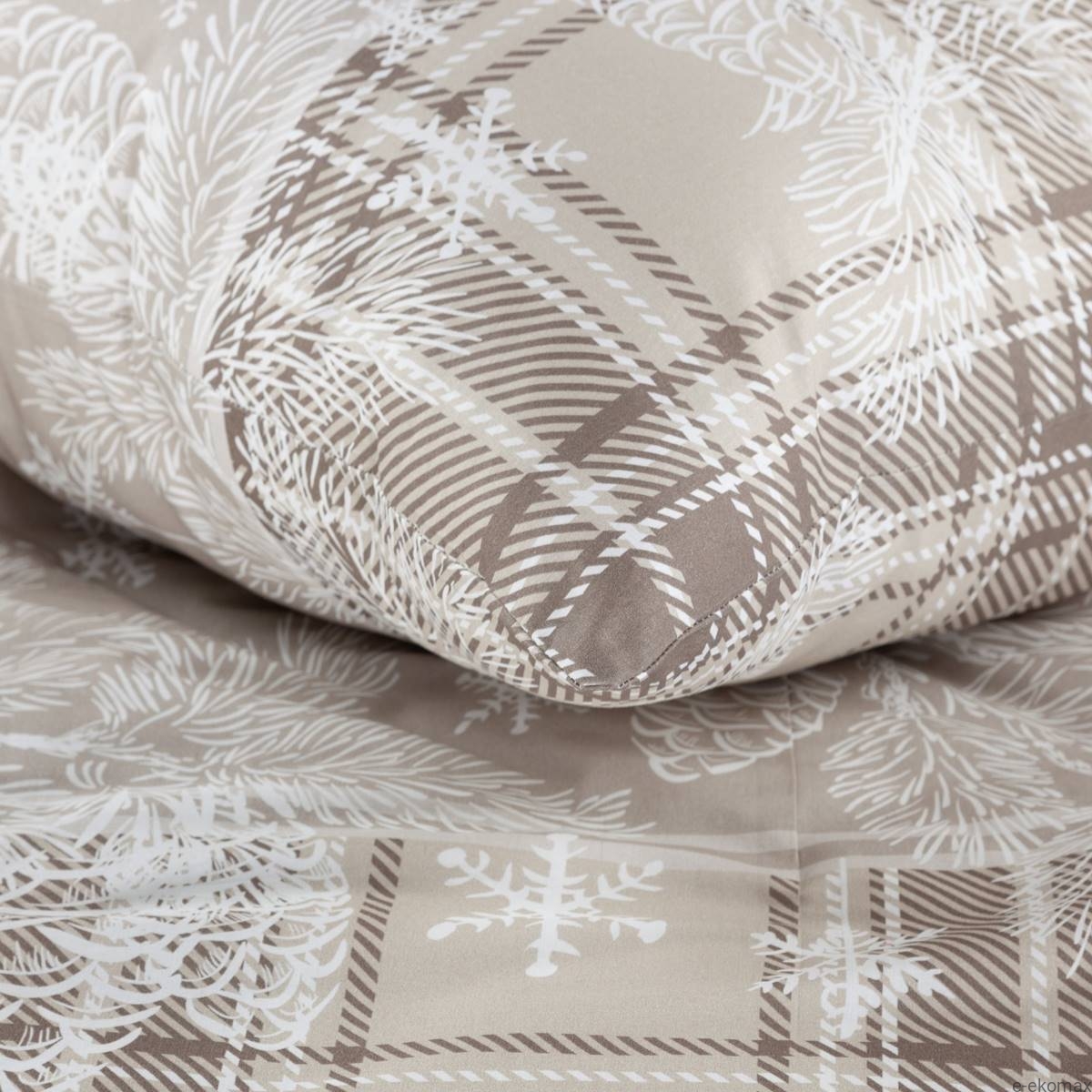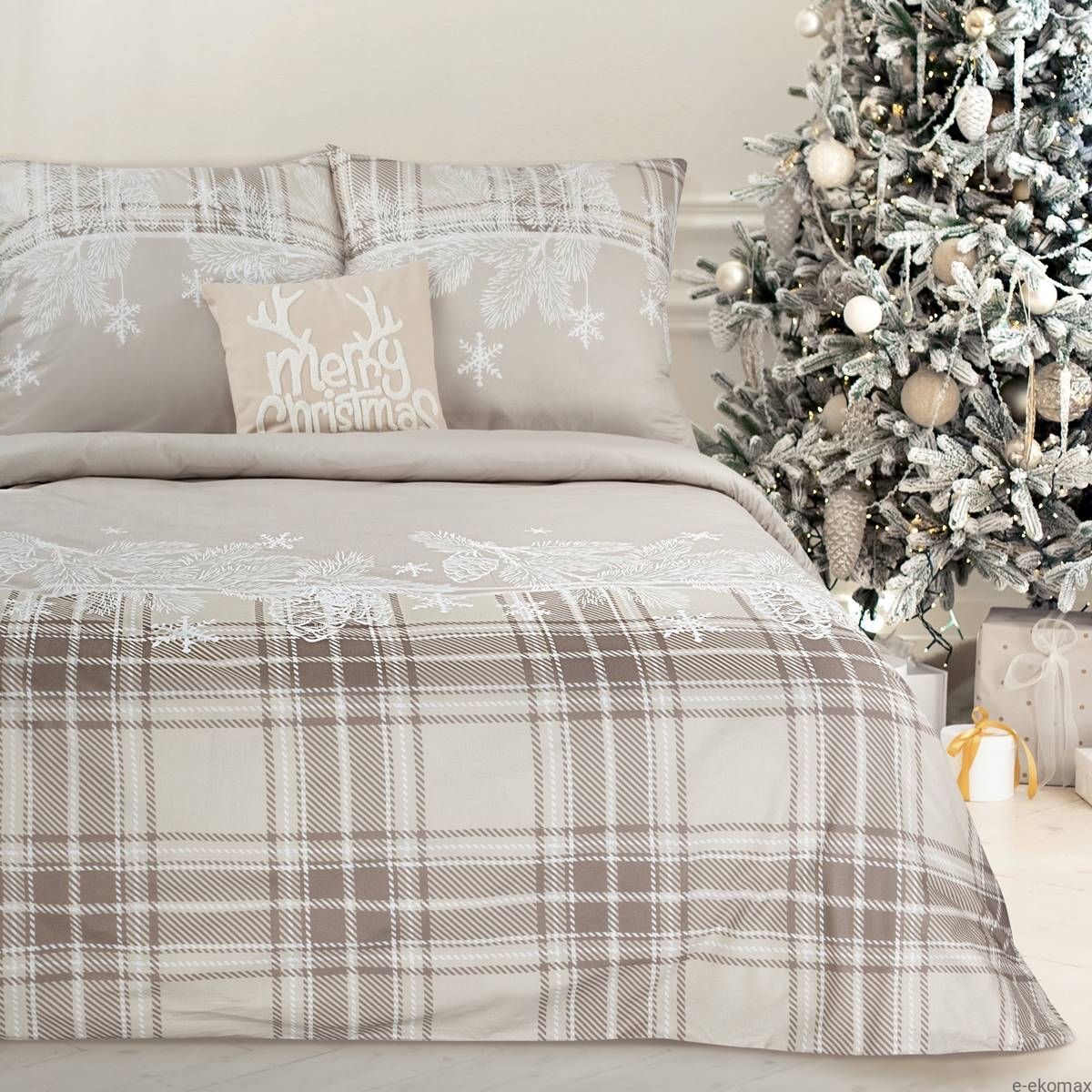 Motyw świąteczny z delikatnymi, zimowymi wzorami wprowadzi do Twojej sypialni ciepłą i przytulną atmosferę świąt. Subtelne wzory śnieżynek i gałązek choinki na tle eleganckiej kratki tworzą harmonijną kompozycję, która zachwyci każdego. To doskonały wybór na okres świąteczny, który z pewnością doda uroku i ciepła każdemu wnętrzu.