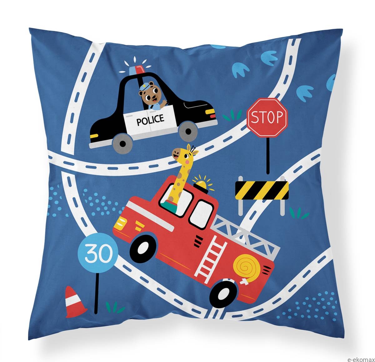 Dziecięca poszewka 40x40 z uroczym motywem ulicy, radiowozu i wozu strażackiego z zabawnymi zwierzątkami to doskonały element dekoracyjny i użytkowy do pokoju malucha. Na niebieskim tle rozciągają się wijące się drogi, znaki drogowe i pojazdy prowadzone przez zwierzęcych bohaterów, takich jak żyrafa czy miś-policjant, co rozwija dziecięcą wyobraźnię i zachęca do zabawy w ruch uliczny.