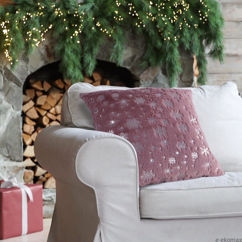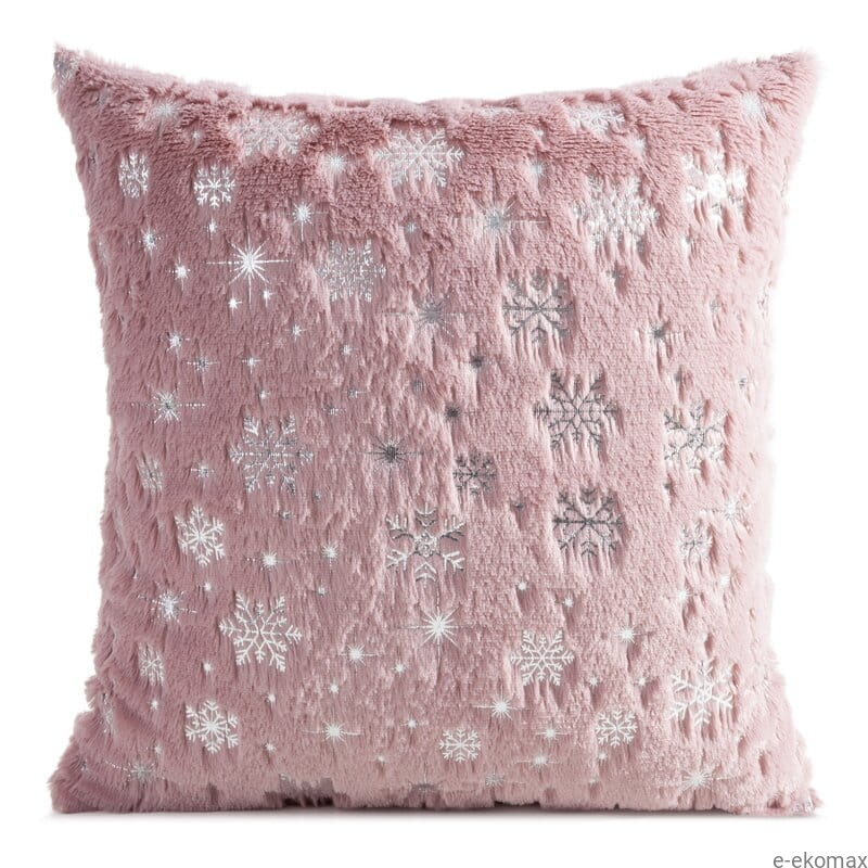 Dodaj swojemu wnętrzu odrobinę wyjątkowego blasku dzięki futrzanej poszewce świątecznej w odcieniu pudrowego różu. Zdobiona srebrnym nadrukiem śnieżynek i gwiazdek, zachwyca elegancją i subtelnym połyskiem, idealnie komponując się z bożonarodzeniowymi dekoracjami.