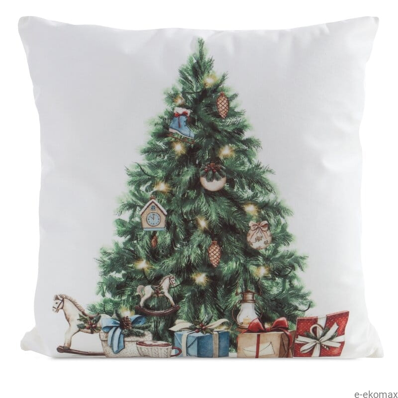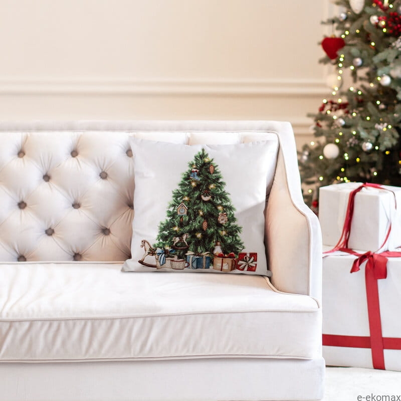 Wprowadź do swojego domu magię świąt dzięki poszewce dekoracyjnej ozdobionej realistycznym nadrukiem choinki. Zielone drzewko udekorowane bombkami, szyszkami i świątecznymi ozdobami, otoczone prezentami, wprowadza do wnętrza ciepło i wyjątkową atmosferę Bożego Narodzenia.