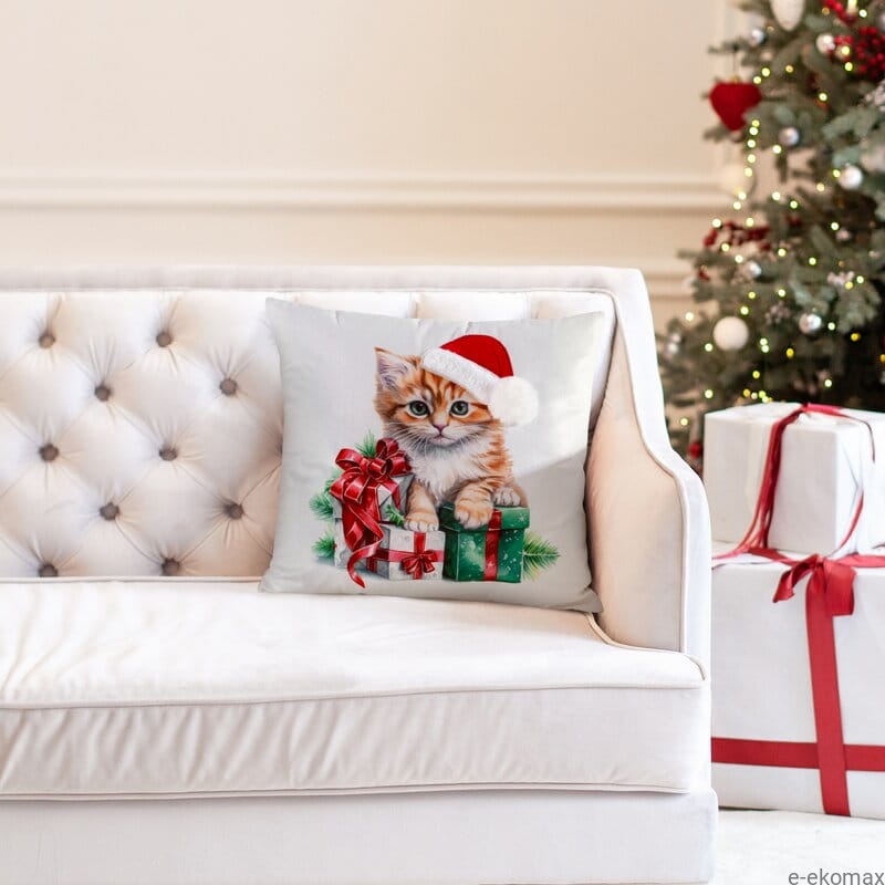 Wprowadź do swojego domu odrobinę świątecznej radości dzięki świątecznej poszewce dekoracyjnej z uroczym nadrukiem kotka w czerwonej czapce Mikołaja. Obrazek uzupełniają barwne prezenty przewiązane wstążkami oraz zielone gałązki, które tworzą magiczny, bożonarodzeniowy klimat.