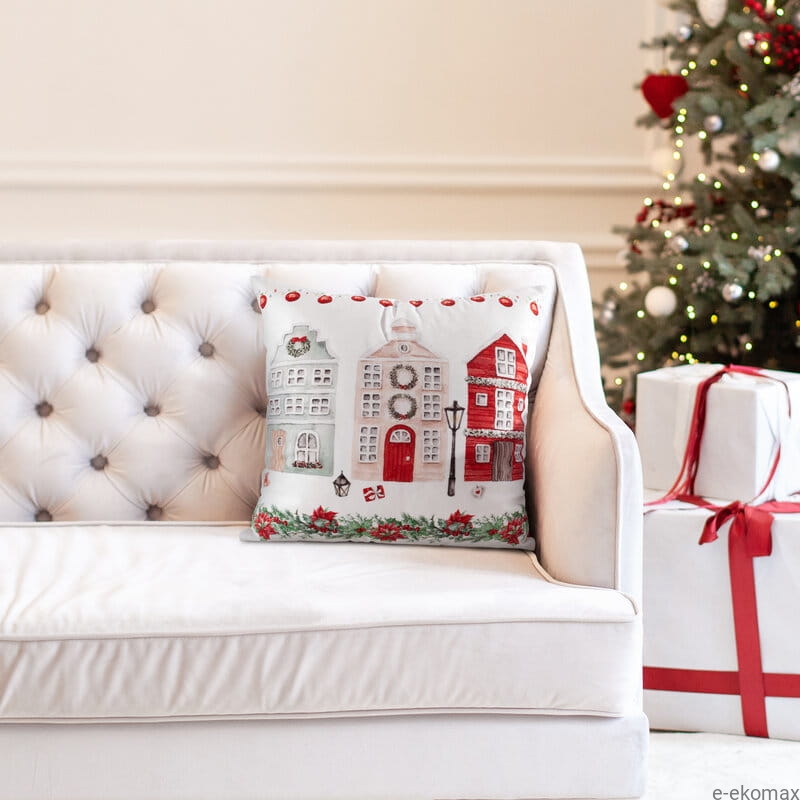 Nadaj swojemu wnętrzu bajkowego klimatu dzięki świątecznej poszewce dekoracyjnej z nadrukiem urokliwych, świątecznych domków. Zdobienia w postaci wieńców, lampek i czerwonych poinsecji wprowadzają ciepło oraz magię Bożego Narodzenia, przenosząc Cię na nastrojową, zimową uliczkę.