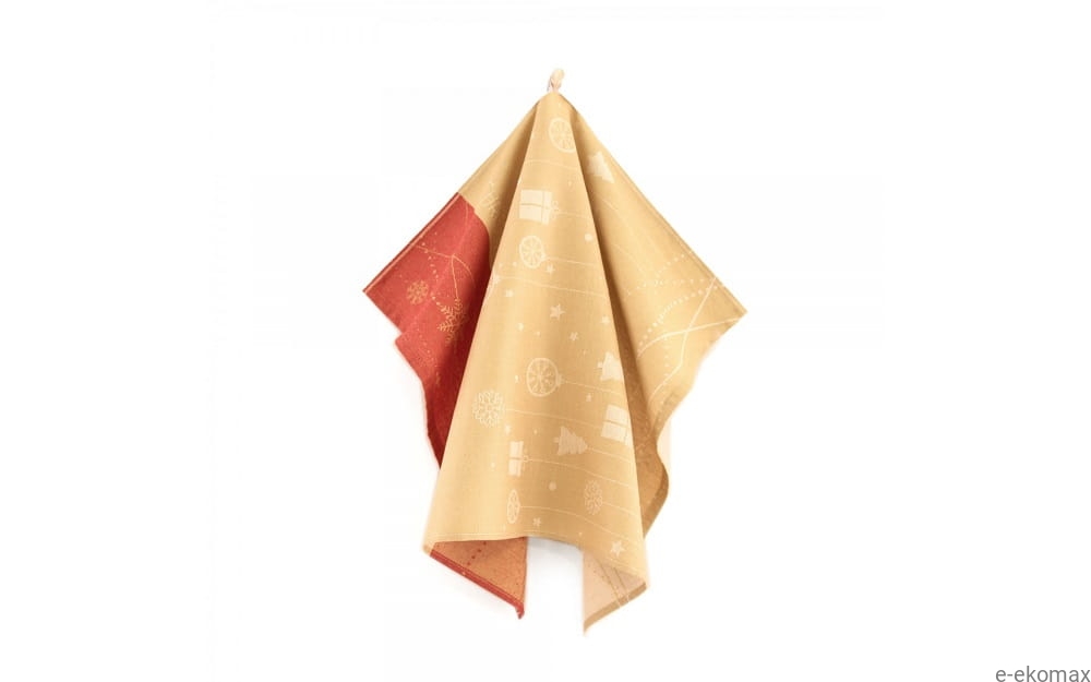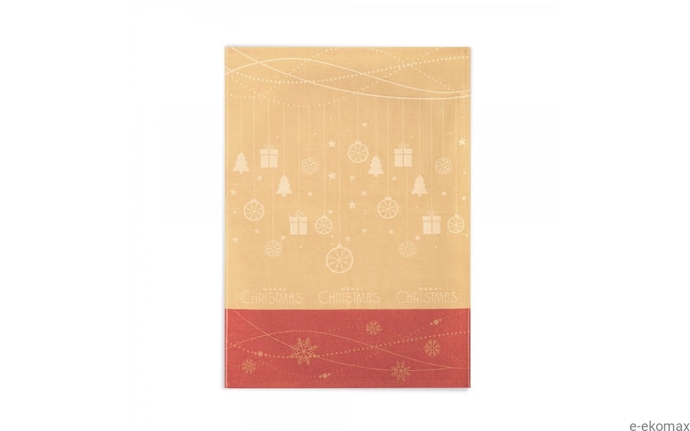 Dodaj świętom wyjątkowego klimatu dzięki eleganckiej ściereczce kuchennej „Merry Time” w ciepłej beżowo-czerwonej kolorystyce. Dekoracyjny nadruk w postaci zawieszonych na sznurkach prezentów, bombek i choinek wprowadza nastrojową atmosferę Bożego Narodzenia, a czerwony pas z motywem śnieżynek i napisem „Merry Christmas” efektownie dopełnia całość.