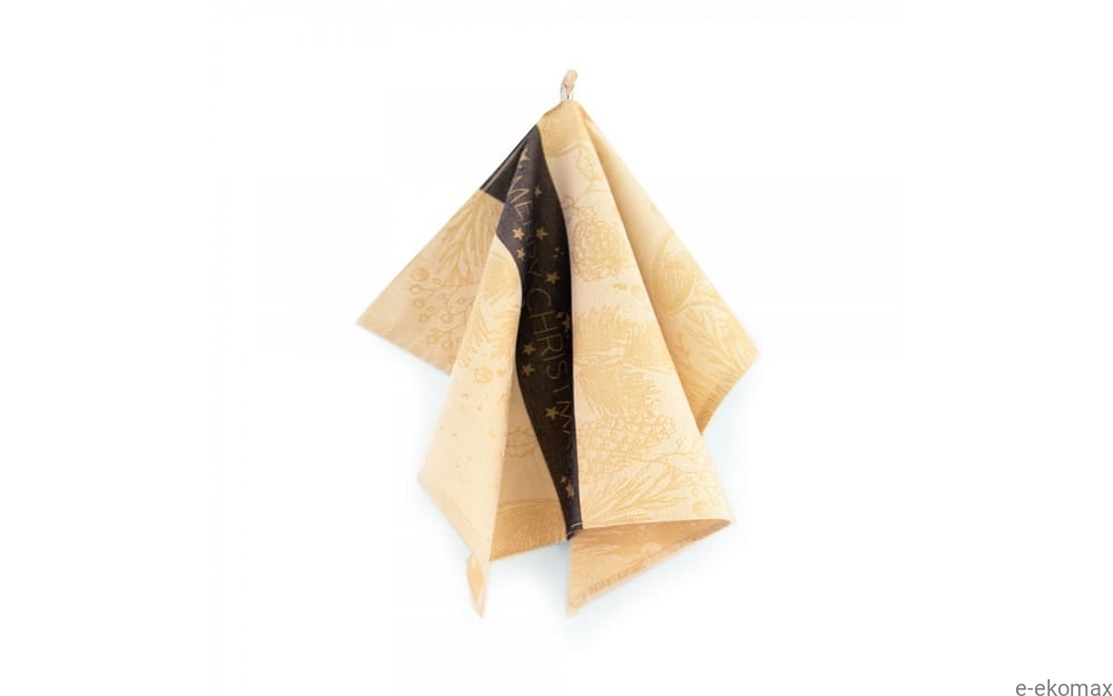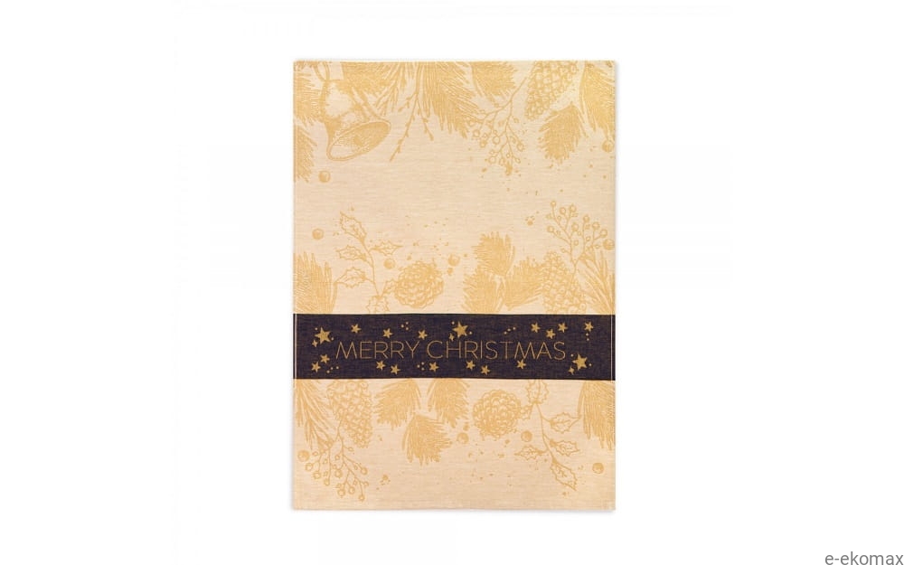 Ścierka kuchenna „Christmas Mood” to połączenie elegancji i świątecznego nastroju w wyjątkowym wydaniu. Beżowe tło ozdobione delikatnym motywem szyszek, gałązek, ostrokrzewu i dzwoneczków tworzy harmonijną, naturalną kompozycję. Centralną część przecina efektowny, ciemnoniebieski pas z napisem „Merry Christmas” oraz gwiazdkami, nadając całości elegancki, świąteczny charakter.