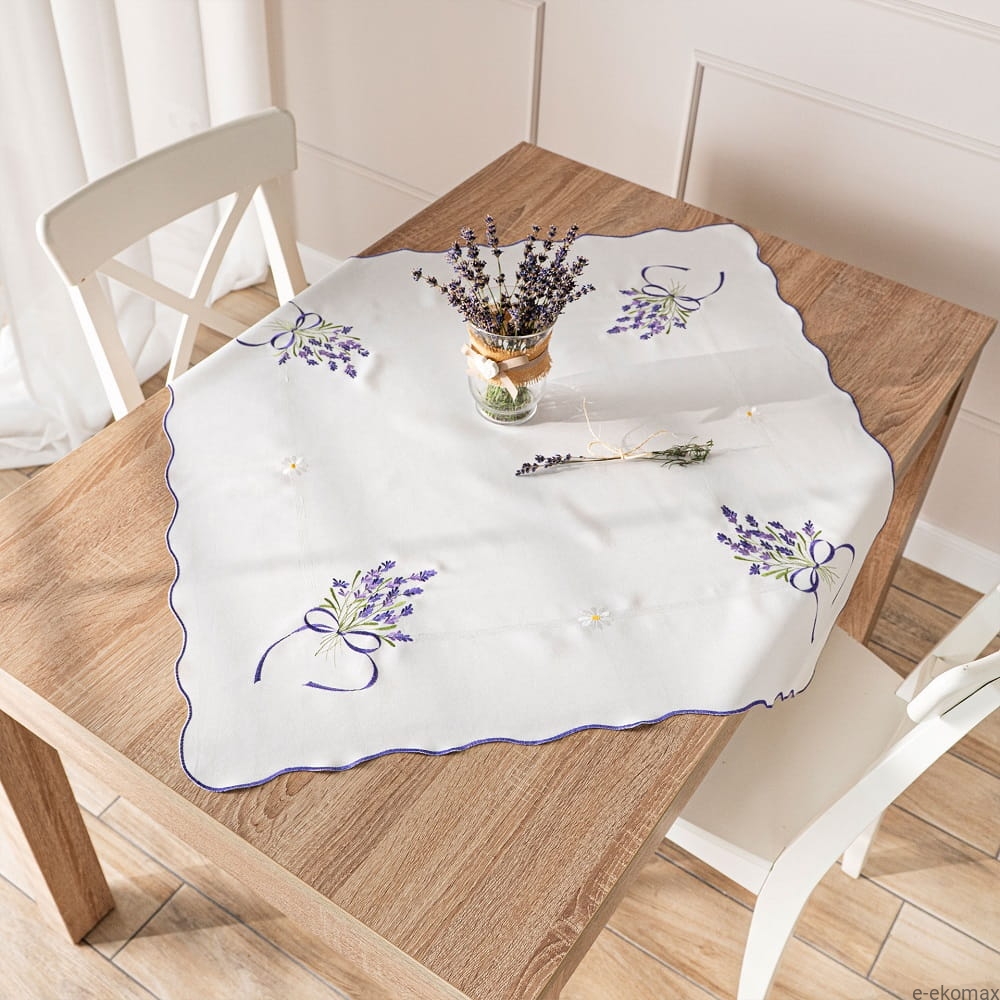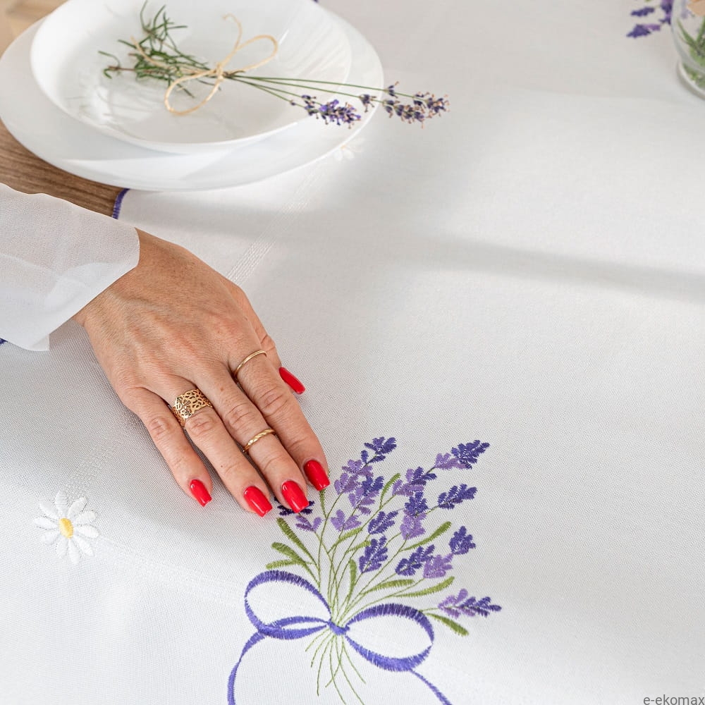 Serweta Lawendowa Polana 85x85 to wyjątkowa dekoracja stołu, która wniesie do wnętrza subtelną świeżość i romantyczny klimat prowansalskich ogrodów. Delikatny, biały materiał został ozdobiony haftowanymi bukiecikami lawendy przewiązanymi fioletową wstążką oraz drobnymi stokrotkami, które dodają całości lekkości i naturalnego uroku. Fioletowa, falowana lamówka pięknie podkreśla kształt serwety, czyniąc ją niezwykle efektowną ozdobą.