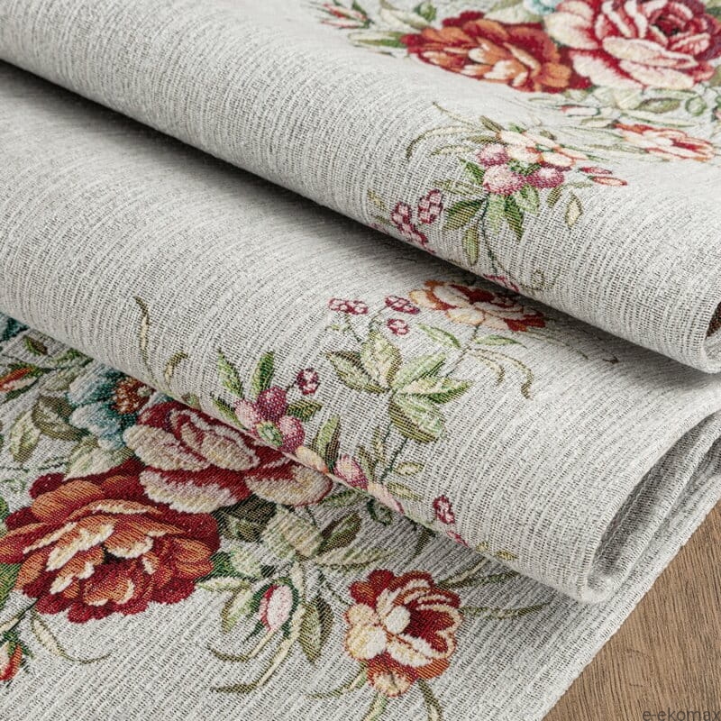 Serweta gobelinowa o wymiarach 100x100 cm to elegancka dekoracja stołu, która łączy klasyczne wzornictwo z wysoką jakością wykonania. Delikatnie popielate tło nadaje całości subtelny, neutralny charakter i pięknie podkreśla bogaty motyw kwiatowy. Wzór przedstawia stylizowane kwiaty przypominające róże i piwonie, uzupełnione drobnymi kwiatkami oraz zielonymi liśćmi, tworząc harmonijną i dekoracyjną kompozycję inspirowaną klasycznym gobelinem.