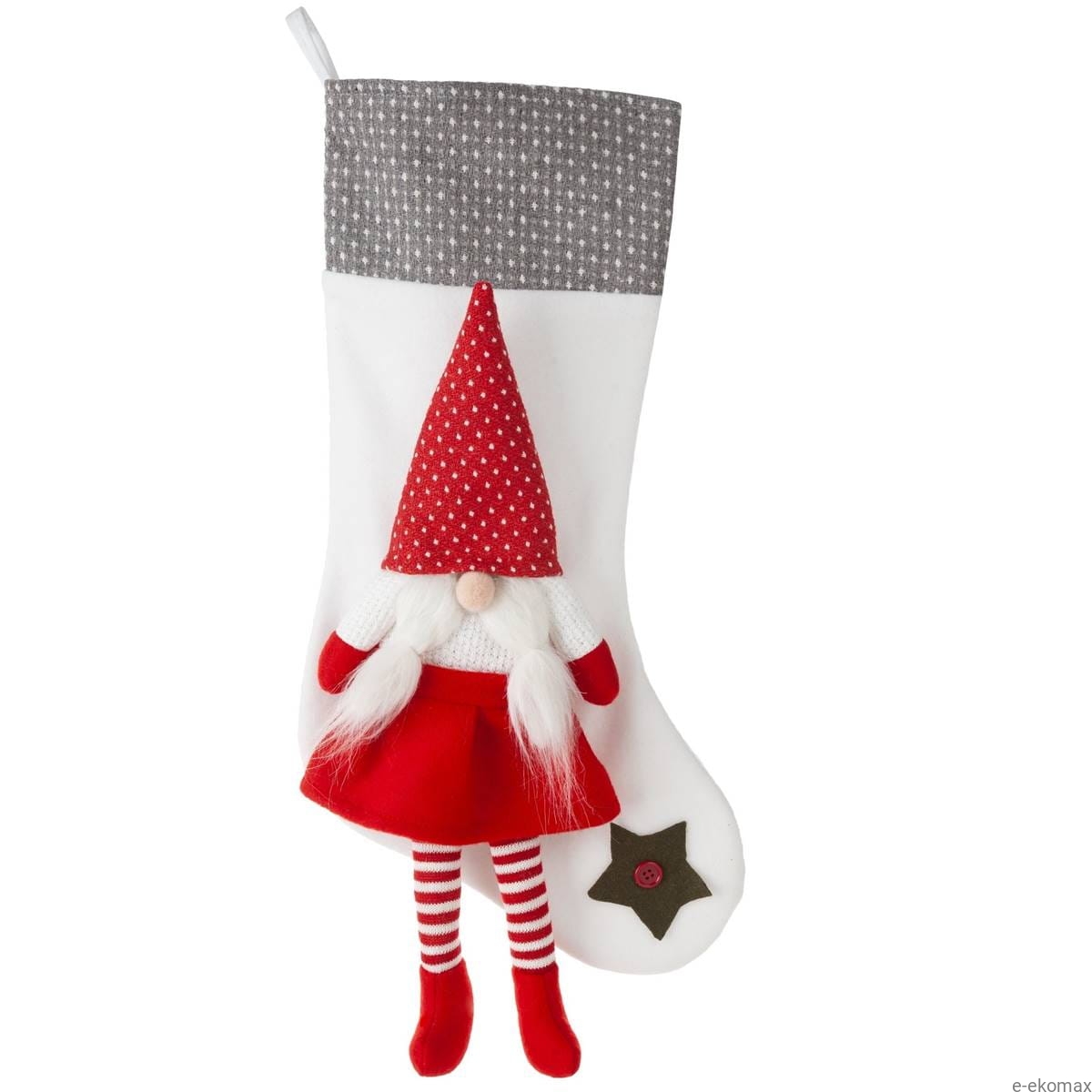 Jednym z najbardziej uroczych elementów tej skarpety jest dekoracyjny gnom umieszczony na jej przodzie. Gnom ma czerwony, spiczasty kapelusz w białe kropki, biały sweter, czerwone rękawiczki oraz czerwoną spódniczkę. Jego białe włosy i broda, wykonane z miękkiego materiału, dodają mu przytulnego wyglądu. Czerwone paskowane rajstopy i buty dopełniają jego świąteczny strój, tworząc razem uroczy i radosny obrazek, który przyciąga wzrok i wprowadza do wnętrza wesoły, świąteczny nastrój.
