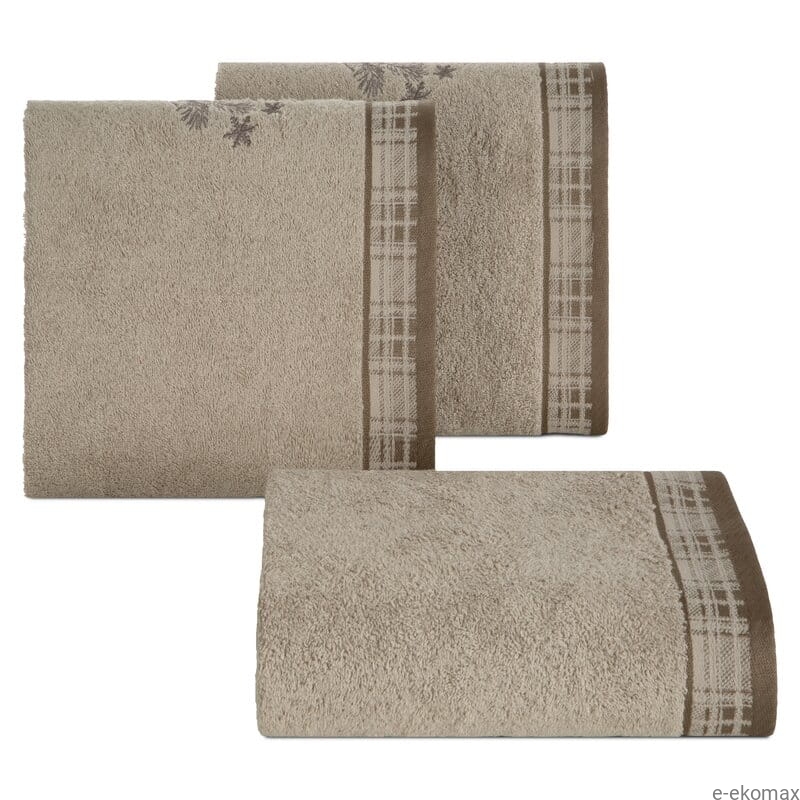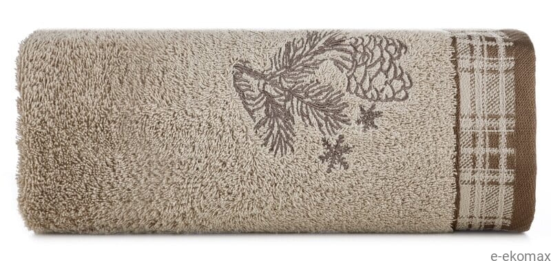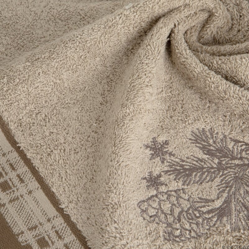 Zimowy ręcznik bawełniany 50x90 cm – taupe z haftem szyszek i śnieżynek