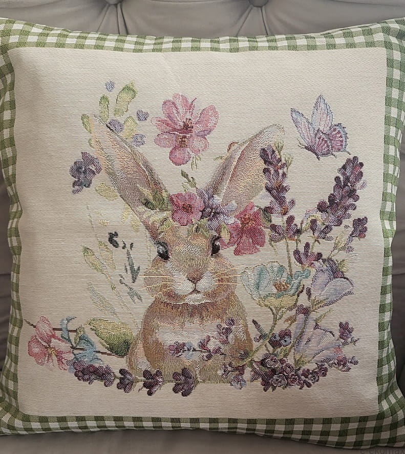 Dekoracyjna poszewka gobelinowa o wymiarach 45x45 to idealny dodatek na Wielkanoc, który wprowadzi do wnętrza ciepły, wiosenny klimat. Wykonana z wysokiej jakości tkaniny gobelinowej, prezentuje piękny wzór z zajączkiem otoczonym kwiatami i motylami. Obramowanie w zielono-białą kratkę dodaje uroku i sprawia, że poszewka doskonale komponuje się z naturalnymi, rustykalnymi i klasycznymi aranżacjami wnętrz.