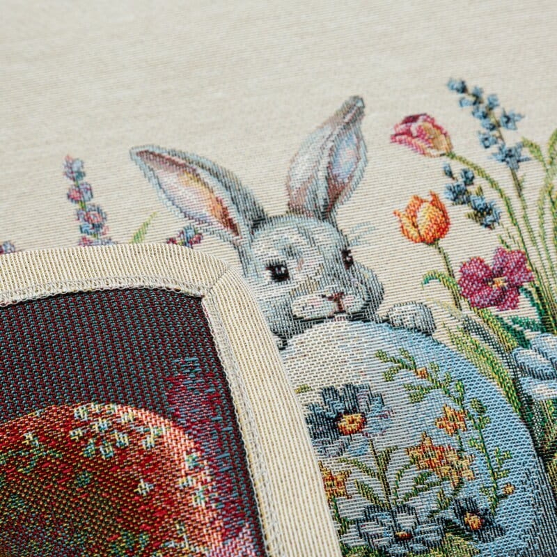 Gobelinowy bieżnik wielkanocny 40x140 cm to stylowa dekoracja stołu, która pięknie podkreśli świąteczną aranżację wnętrza. Tkany wzór z uroczym zajączkiem, kolorowymi pisankami oraz wiosennymi kwiatami tworzy ciepłą, radosną kompozycję idealną na Wielkanoc.
